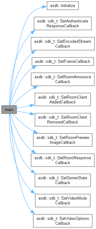References asdk::AuthenticationResponseSuccess, context_s::clientRoomID, asdk::frame_t::data, asdk::frame_t::height, asdk::Initialize(), context_s::roomJoinedState, RoomJoinedStateError, RoomJoinedStateReceivedList, RoomJoinedStateSuccess, RoomJoinedStateUndef, asdk::RoomResponseSuccess, context_s::sdk, context_s::serverState, asdk::ServerStateAuthenticateError, asdk::ServerStateConnectedAndAuthenticated, asdk::ServerStateUndef, asdk::sdk_t::SetAuthenticateResponseCallback(), asdk::sdk_t::SetEncodedStreamCallback(), asdk::sdk_t::SetFrameCallback(), asdk::sdk_t::SetRoomAnnounceCallback(), asdk::sdk_t::SetRoomClientAddedCallback(), asdk::sdk_t::SetRoomClientRemovedCallback(), asdk::sdk_t::SetRoomPreviewImageCallback(), asdk::sdk_t::SetRoomResponseCallback(), asdk::sdk_t::SetServerStateCallback(), asdk::sdk_t::SetVideoModeCallback(), asdk::sdk_t::SetVideoOptionsCallback(), context_s::state, StateConnect, StateConnecting, StateDisconnect, StateReady, StateRequestJoinRoomPending, StateRequestRooms, StateRequestRoomsPending, asdk::StreamType264Frame, asdk::StreamType265Frame, asdk::StreamTypeAV1Frame, asdk::StreamTypeMPEGTS, asdk::StreamTypeUnknown, asdk::StreamTypeWEBP, and asdk::frame_t::width.